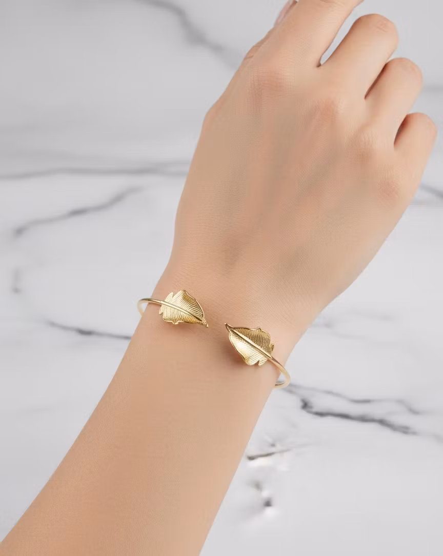 Upptäck skönheten i enkelheten med vår eleganta bladarmring. Detta öppna armband är omsorgsfullt utformat med två vackra blad som möts i en harmonisk design. Den nätta och smidiga formen gör att smycket känns lätt och bekvämt på handleden, samtidigt som den guldglänsande finishen ger en lyxig känsla.