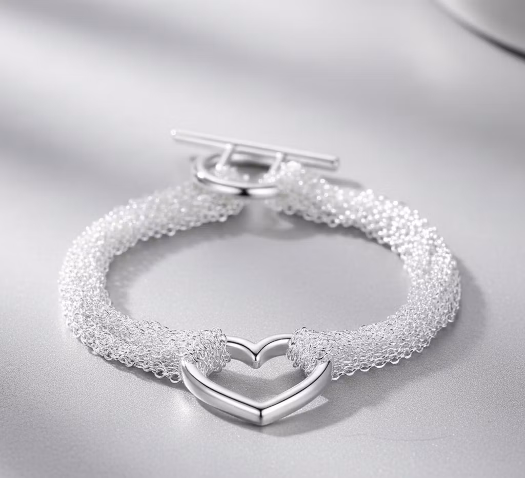 Upptäck skönheten i vårt eleganta nätarmband, ett smycke som verkligen sticker ut. Detta armband är skapat med en sofistikerad vävd nätstruktur som ger en fyllig men ändå lätt och luftig känsla runt handleden. I centrum glänser ett vackert, polerat hjärta som symboliserar tidlös kärlek och vänskap.