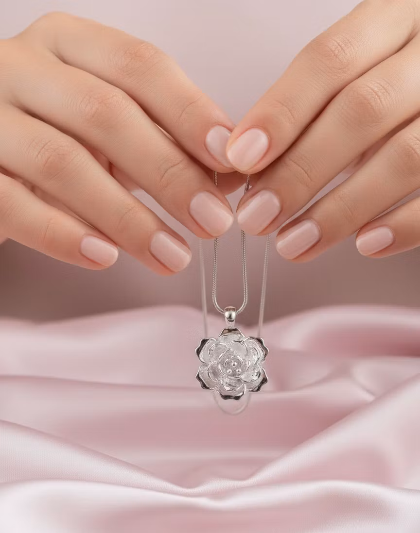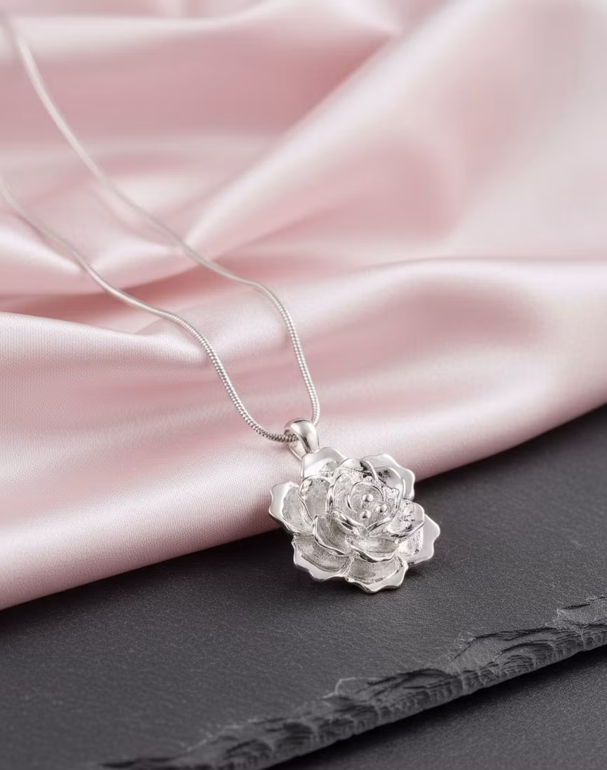 Hänget är utformat som en detaljrik ros i full blom, tillverkat med en silkeslen finish som reflekterar ljuset på ett mjukt och behagfullt sätt.