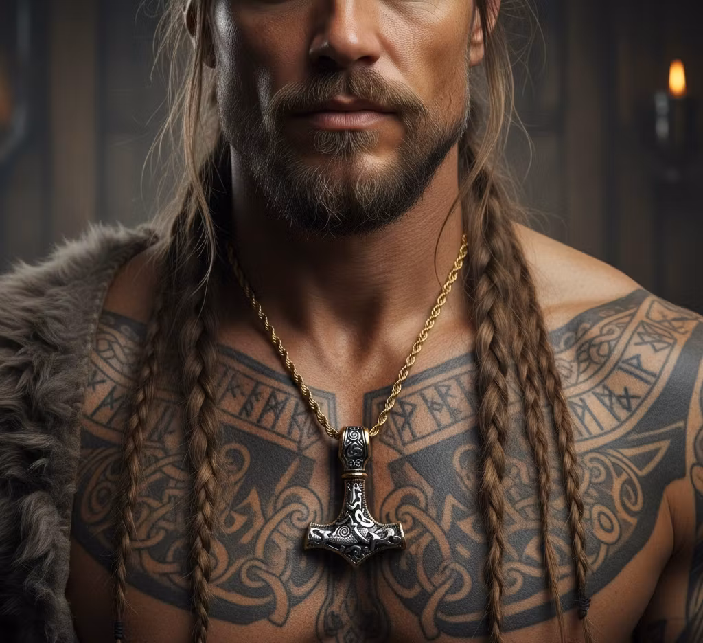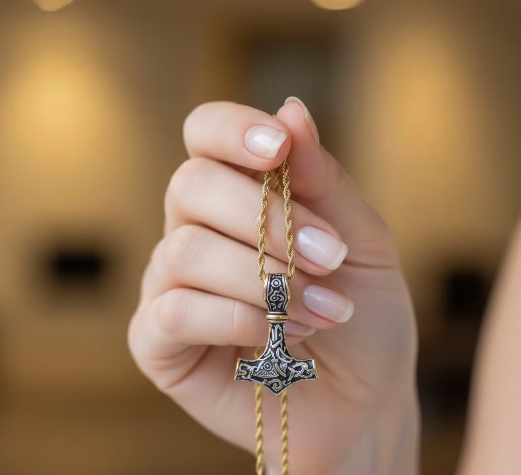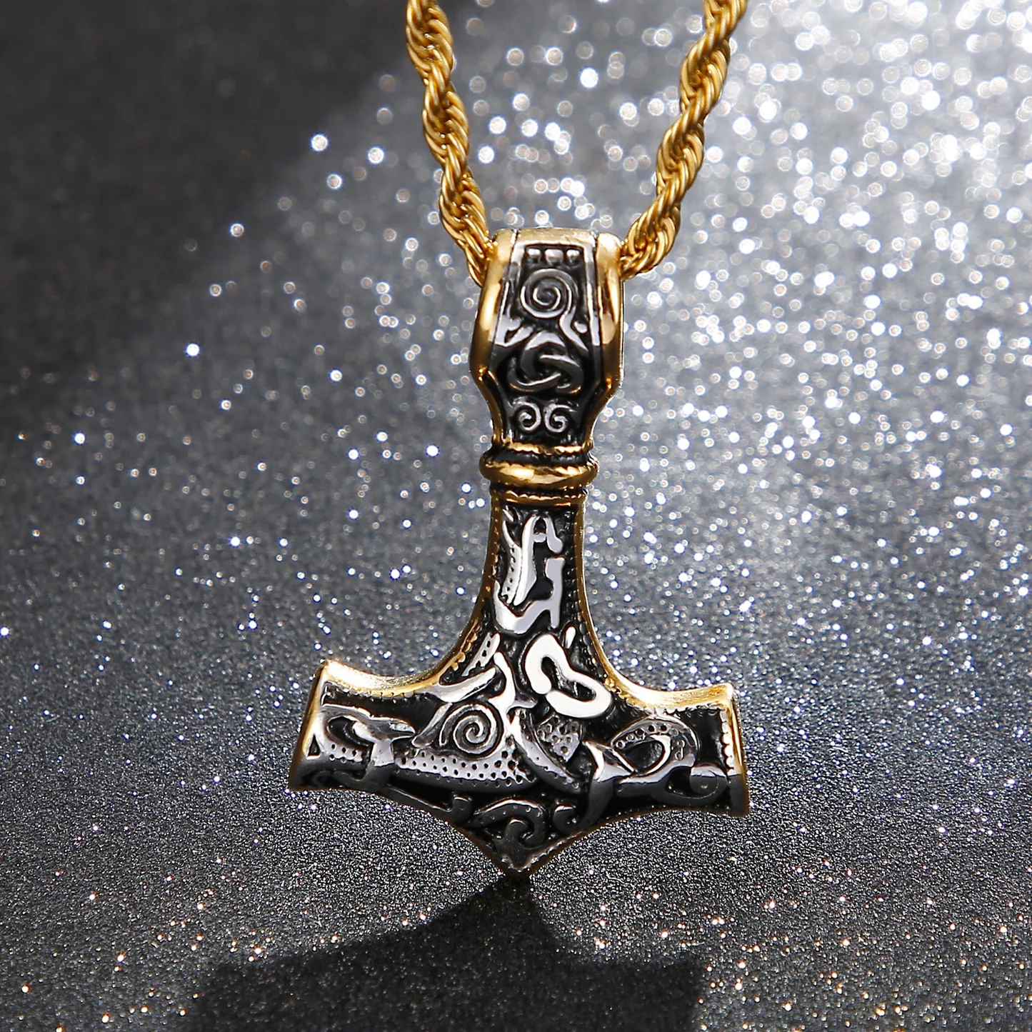 Design: En detaljrik tolkning av den legendariska hammaren Mjölnir, prydd med nordiska slingor och ett stadigt fäste som matchar den medföljande kedjan.