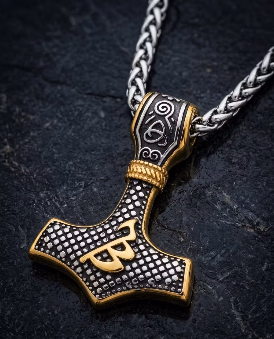 Upptäck kraften i detta detaljrika hängsmycke föreställande Mjölner, Tors legendariska hammare. Designen är en perfekt balans mellan traditionellt hantverk och modern estetik, med vackra guld- och silverkontraster som verkligen fångar ögat. Smycket är prydt med intrikata nordiska mönster och symboler som ger en unik karaktär.