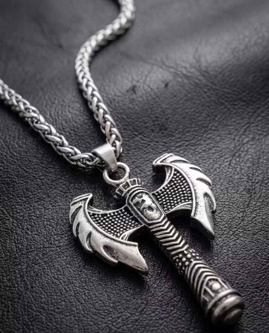 Detta unika smycke är designat för att fånga blickar. Med sin detaljrika dubbelax-form och vackra mönster ger det en känsla av äventyr och styrka. Den antika finishen skapar en snygg kontrast som passar lika bra till vardagslooken som till festen. Oavsett om du bär det själv eller ger bort det som en present, är detta ett tillbehör som utstrålar karaktär.