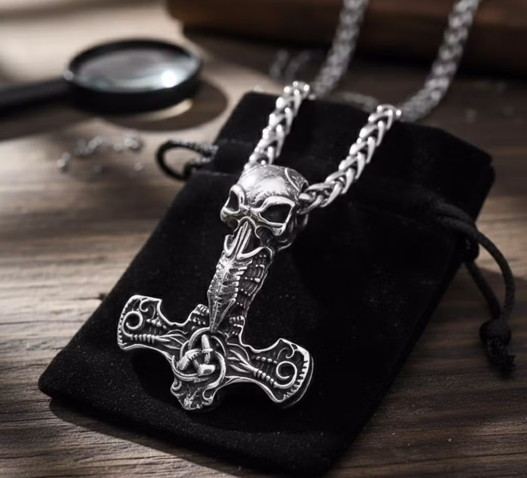 Detta unika och fängslande hänge är en lekfull och charmig tolkning av den legendariska Tors hammare, Mjölner. Designen kombinerar den kraftfulla symbolismen av det fornnordiska vapnet med en dos karaktär genom att placera en detaljerad döskalle som en integrerad del av hammarens huvud. Hammarens klor är smyckade med komplicerade, nordiska knutmönster som reflekterar vikingatidens hantverk. Trots sin robusta inspiration är hängets storlek avsiktligt liten och 'söt', vilket gör det till en subtil men ändå uttrycksfull accessoar som kan bäras dagligen. Döskallen på toppen ger ett litet, nästan vänligt leende, vilket bryter av mot den traditionellt skräckinjagande dödssymboliken och skapar en balans mellan coolt och gulligt.