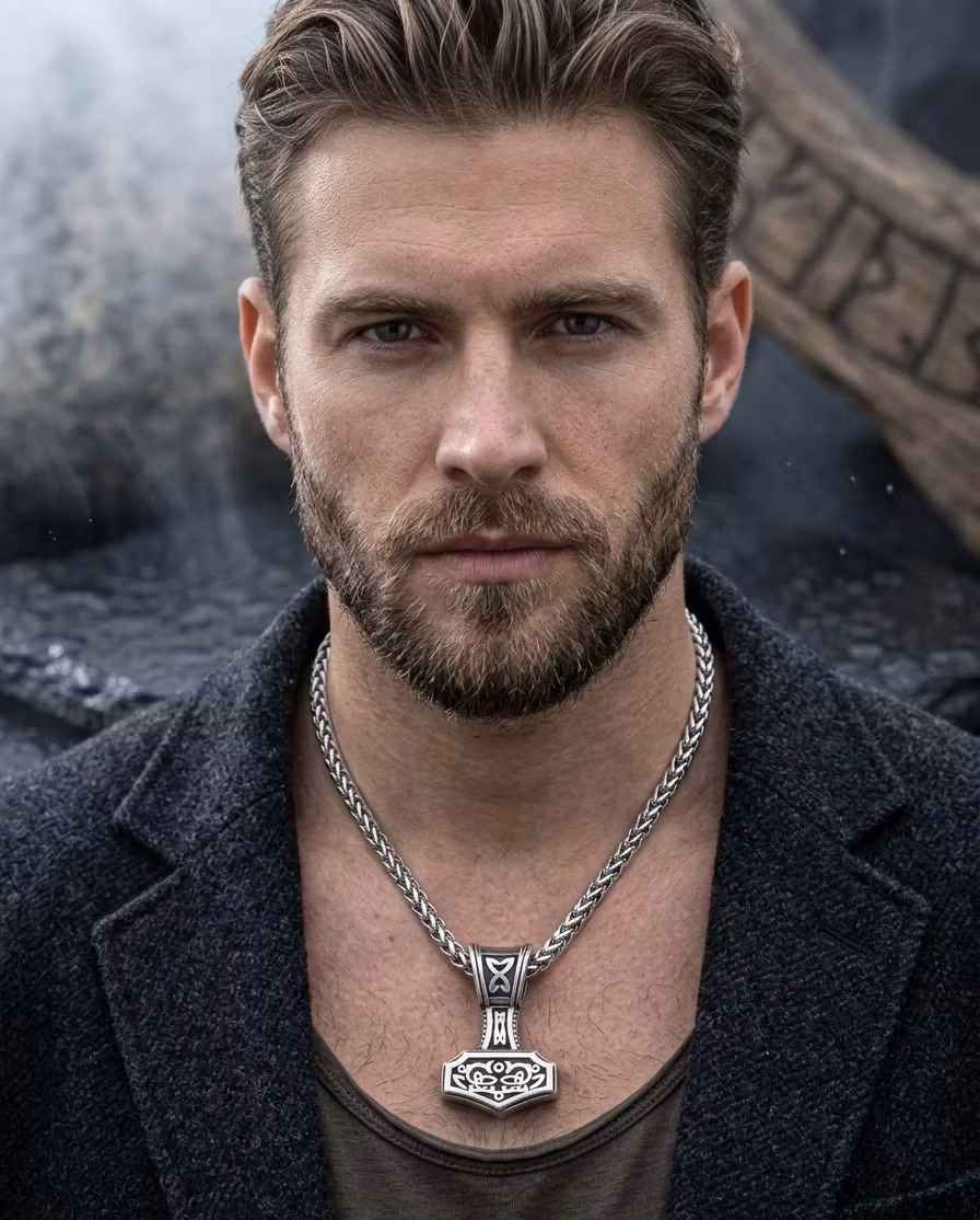 Detta detaljrika hänge är inspirerat av Tors legendariska hammare, Mjölner, som i nordisk mytologi symboliserar både skydd och enorm styrka. Smycket är vackert dekorerat med traditionella nordiska knutmönster och symboler som ger det en unik karaktär och ett autentiskt utseende.