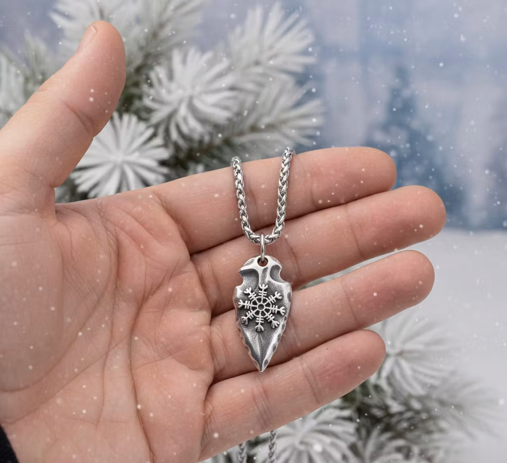 Detta detaljrika smycke förenar den råa formen av en pilspets med den kraftfulla symbolen Aegishjalmur(Skräckhjälmen), som sägs ge bäraren skydd och mod. Den mörka finishen i kontrasterna ger en snygg vintage-känsla som verkligen drar blickarna till sig.