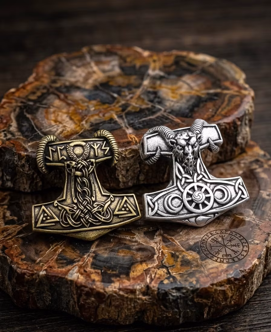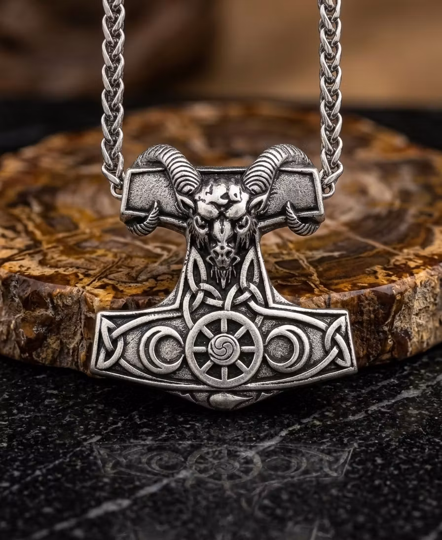 Upplev kraften från förr med vårt unika hängsmycke föreställande Mjölner, Tors hammare. Denna detaljrika design förenar den klassiska hammaren med symbolik från naturen och fornnordisk mystik, dekorerad med ett vackert bockhuvud och intrikata knutmönster.