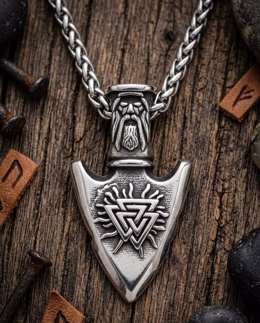 Upplev historiens vingslag med detta detaljrika hängsmycke inspirerat av vikingatiden. Smycket föreställer en pilspets prydd med den symboliska Valknuten, omgiven av solstrålar som representerar ljus och vägledning. Toppen av smycket pryds av ett karaktärsfullt ansikte föreställande en vis krigare eller gud.